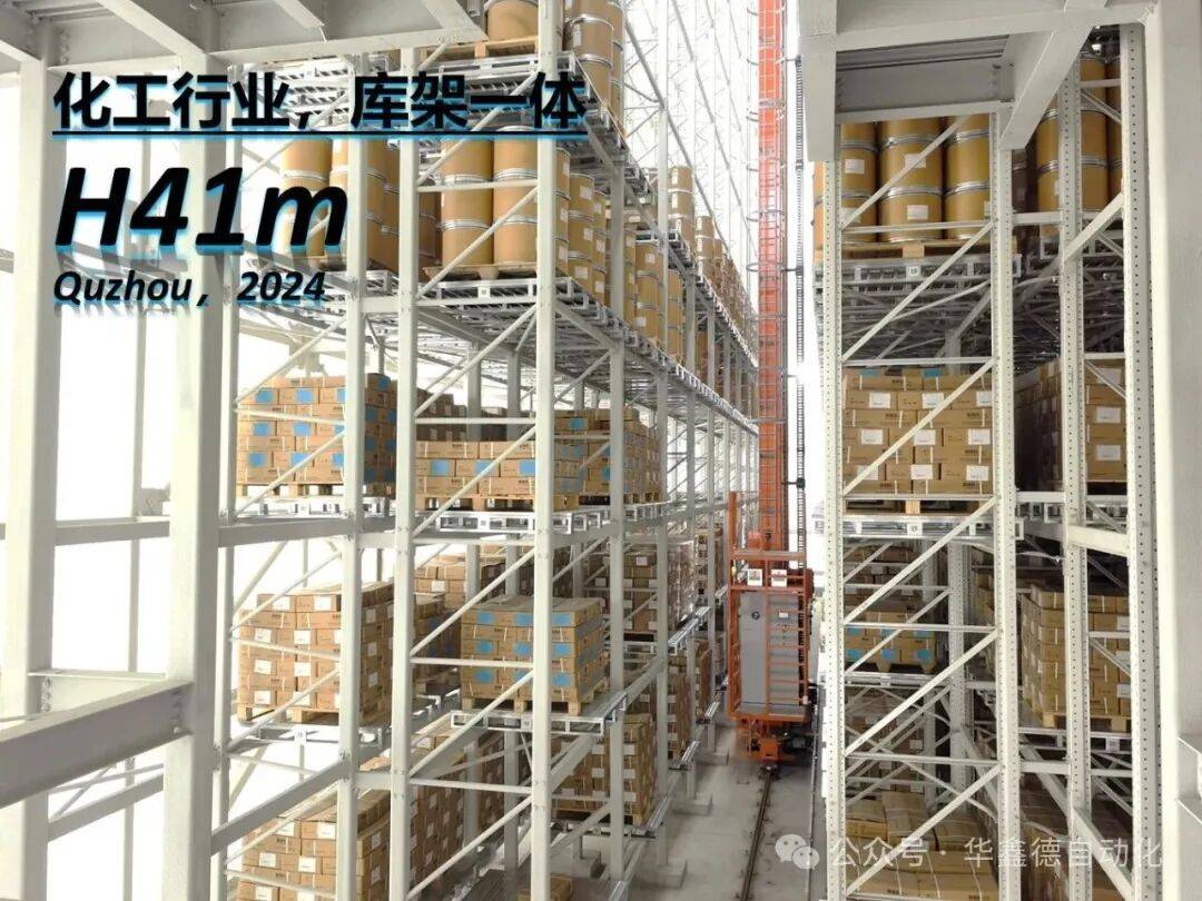 图/化工行业·41米超高库架一体·堆垛机库,项目装备7台超高双深度堆垛机,26排货架,共10000众个货位。立库重要存储有制品、原料、包装物等。通过连廊与车间相连,竣工原料供应、制品入库、制品出库、空托回库等流程的高效流转。