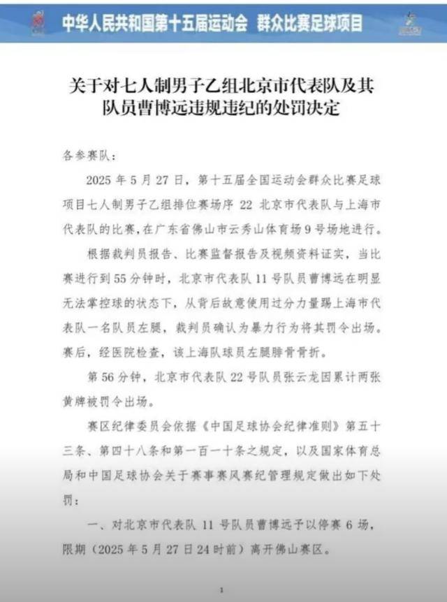 指日有音尘传来,第十五届宇宙运动会(以下简称十五运会)祭出一张重磅罚单。正在七人制男人足球赛事举行功夫,北京代外队的足球运发动曹某某涌现恶意踢踹上海队球员的动作,这一恶毒手脚导致对方球员左腿骨折。为此,曹某某受到停赛6场的处理,同时被责令刻日分开佛山赛区。