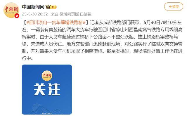 5月30日,据央视音讯报道,正在四川凉山州西昌市G348线马道铁道桥道段,一座铁道桥涌现片面垮塌境况,一辆货车被垮塌的桥体压住。