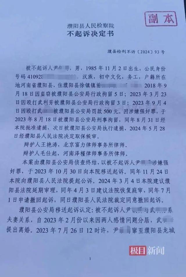 凭据濮阳县公安局的移送告状睹解:被不告状人尹某与武某为伉俪干系。自2023年2月起,因情绪题目,二人起源分炊,功夫武某提出分手。2023年7月26日午时12时安排,尹某前去濮阳县龙城邦际东区某号楼13层,正在主寝室中对武某执行了手脚。昨年7月,濮阳县黎民查察院作出不告状确定,来由是而今案件证据尚不充溢,未抵达告状圭表。若被害人对该确定不服,可正在收到确定书之日起七日内,向濮阳市黎民查察院呈报,恳求提起公诉;也有权不经呈报,直接向濮阳县黎民法院提起刑事自诉。