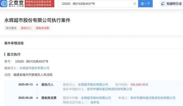 事变的启事为,5月13日,福州市饱楼区黎民法院立案践诺了郑州市唐科废旧物资接纳有限公司申请践诺永辉超市的任事合同缠绕一案。正在该案中,永辉超市未正在指定的限日内推行生效功令文书所确定的给付任务。案件流程消息剖明,此前,永辉超市已因该案件被践诺了39.09万元。