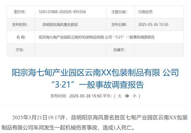 近期,昆明阳宗海光景胜景区统制委员会官方网站颁发了《阳宗海七甸财产园区云南XX包装成品有限公司“3·21”凡是事件侦察呈文》。